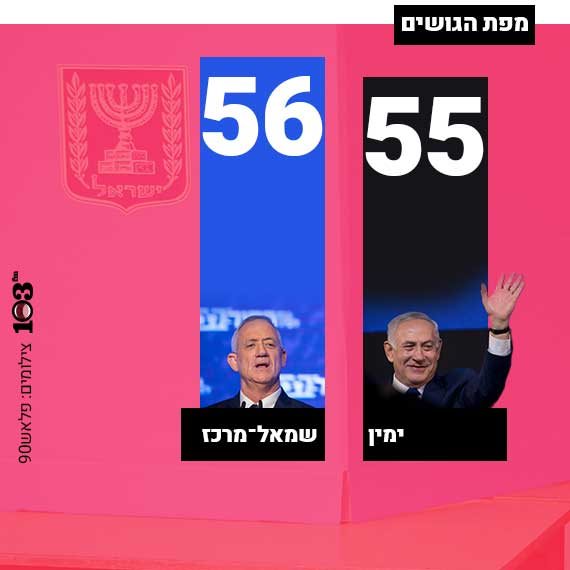 לאחר ספירת 64% מהקולות - גוש תומכי נתניהו וימינה עם 63 מנדטים מול 57 למתנגדיו • כחול לבן מתחזקת, תקווה חדשה מתרסקת • פנינה בת צבי עם התוצאות